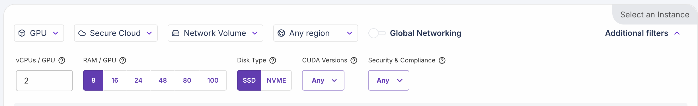 ), ensure the host machine’s CUDA driver version matches or exceeds the template’s requirements.If you encounter errors like “OCI runtime create failed” or “unsatisfied condition: cuda>=X.X”, you need to filter for compatible machines:- Click Additional filters in the Pod creation interface
